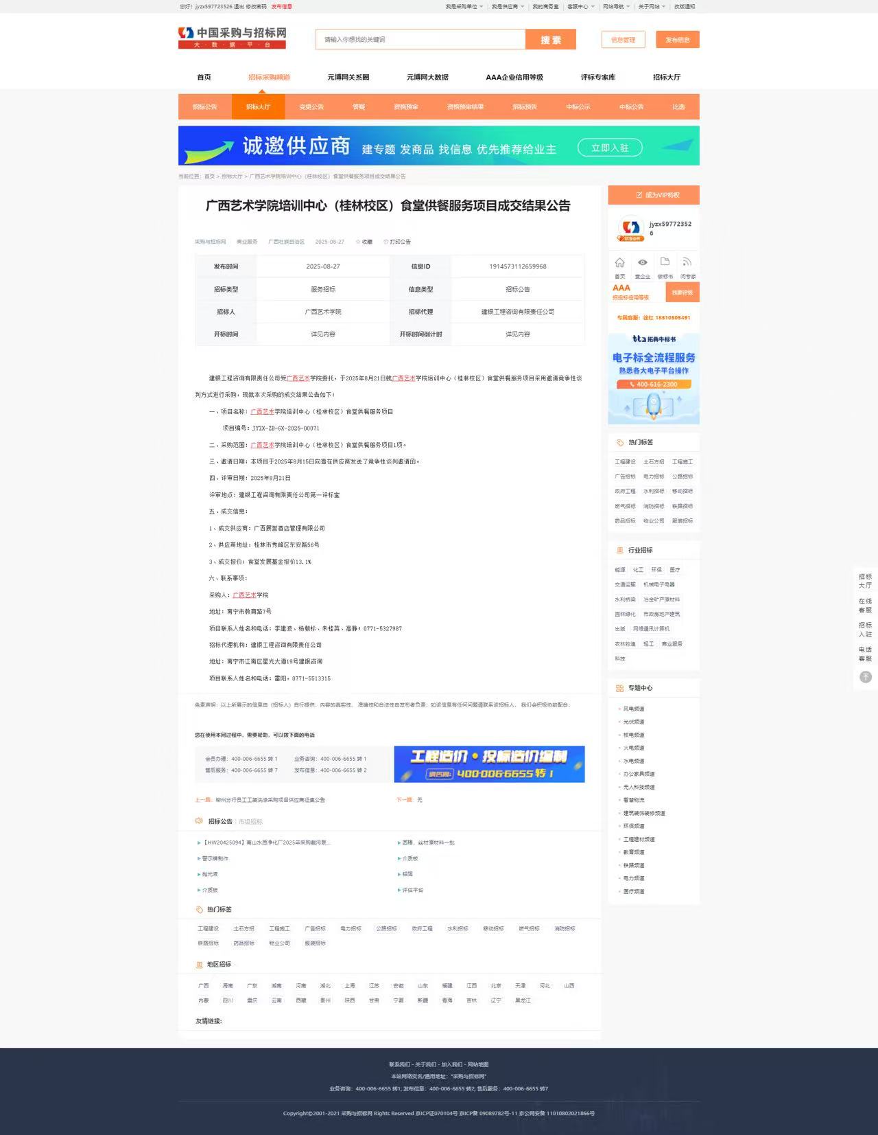 FUN乐天使官方网站培训中心(桂林校区)食堂供餐服务项目成交结果公告 来源: 发布时间:2025-08-27 22:10:02 浏览次数: 次 【字体:小 大】 https://www.chinabidding.cn/public/bidagency/infoDetails?fid=1914573112659968&keywords=%E5%B9%BF%E8%A5%BF%E8%89%BA%E6%9C%AF 成交公告截图.jpg 分享到: 【打印正文】